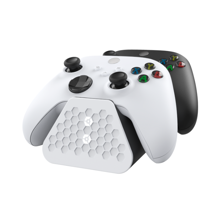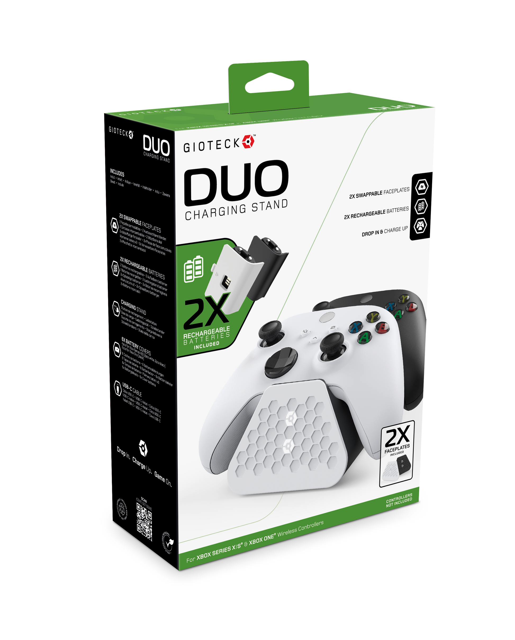 Charge and display your Xbox Wireless Controllers with the Duo Charging Stand. Each Charging Stand includes 2 rechargeable battery packs which will give you hours of gameplay and eliminates the cost of replacement batteries. Not only can you charge two controllers at once, but the included swappable faceplates also allow instant customization to match your Xbox set up for an eye-catching display.